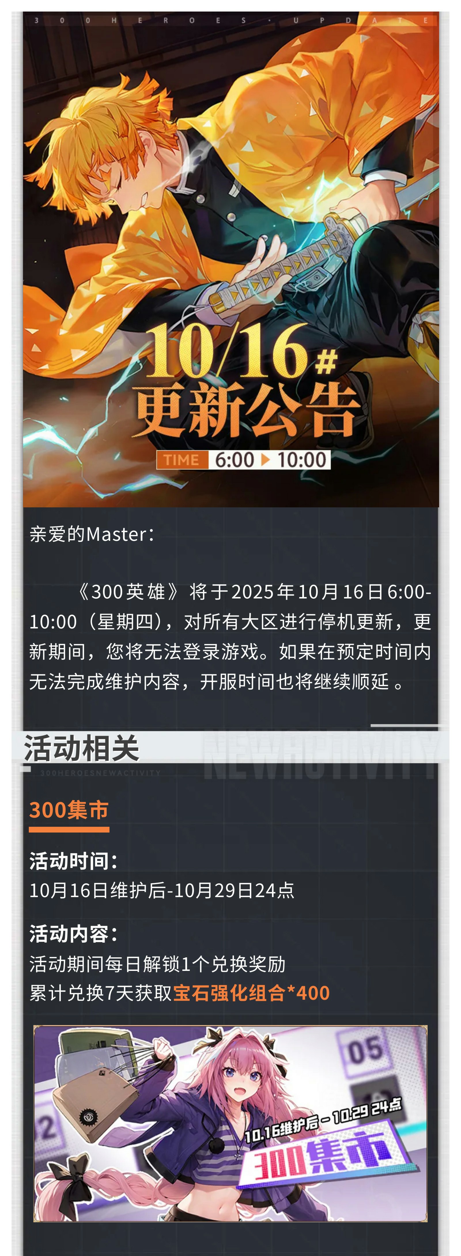 《300英雄》将于2025年10月16日6:00-10:00(星期四),对所有大区进行停机更新,更新期间,您将无法登录游戏。如果在预定时间内无法完成维护内容,开服时间也将继续顺延。