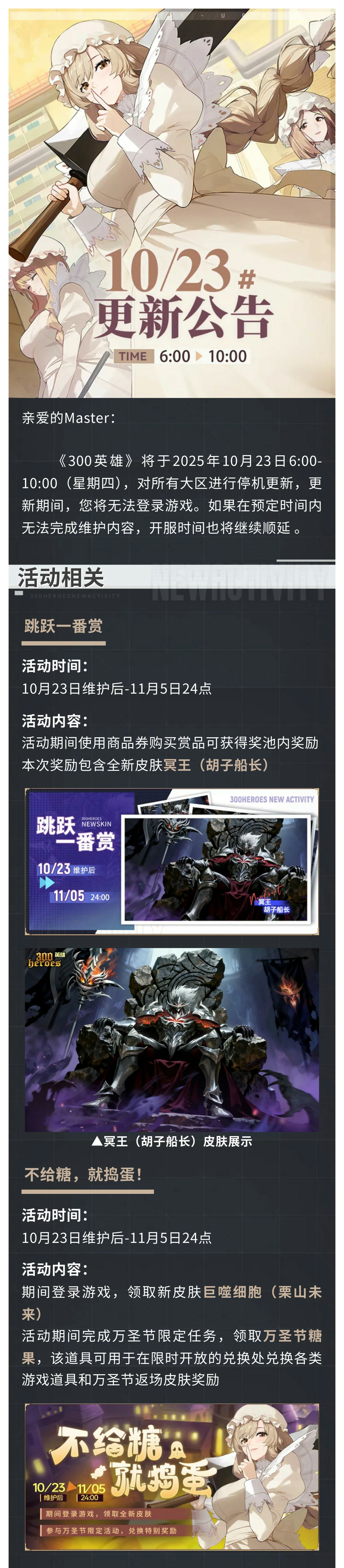 2025年10月23日6:00-10:00更新维护公告 2025-10-22 18:12:36 阅读 183 次 评论 0 条 尊敬的《300英雄》玩家:《300英雄》将于2025年10月23日6:00-10:00(星期四),对所有大区进行停机更新,更新期间,您将无法登录游戏。如果在预定时间内无法完成维护内容,开服时间也将继续顺延。 本文地址:http://www.3atz.top/post/1729.html 版权声明:本文为原创文章,版权归 七彩团 所有,欢迎分享本文,转载请保留出处! 点赞 分享: PREVIOUS:闲置角色预清理公告(10.17) NEXT:已经是最新一篇了 文章导航